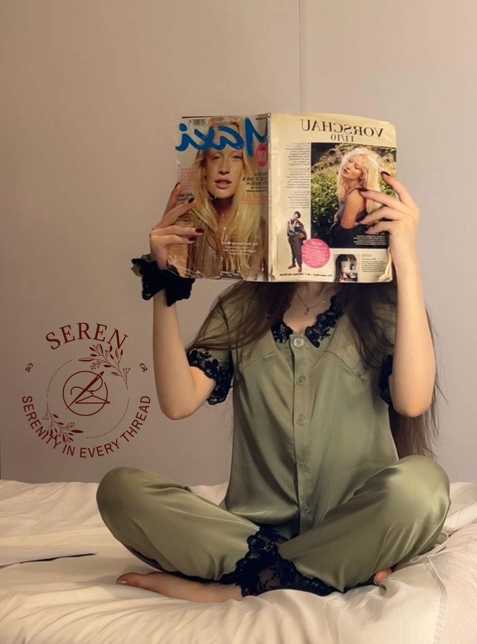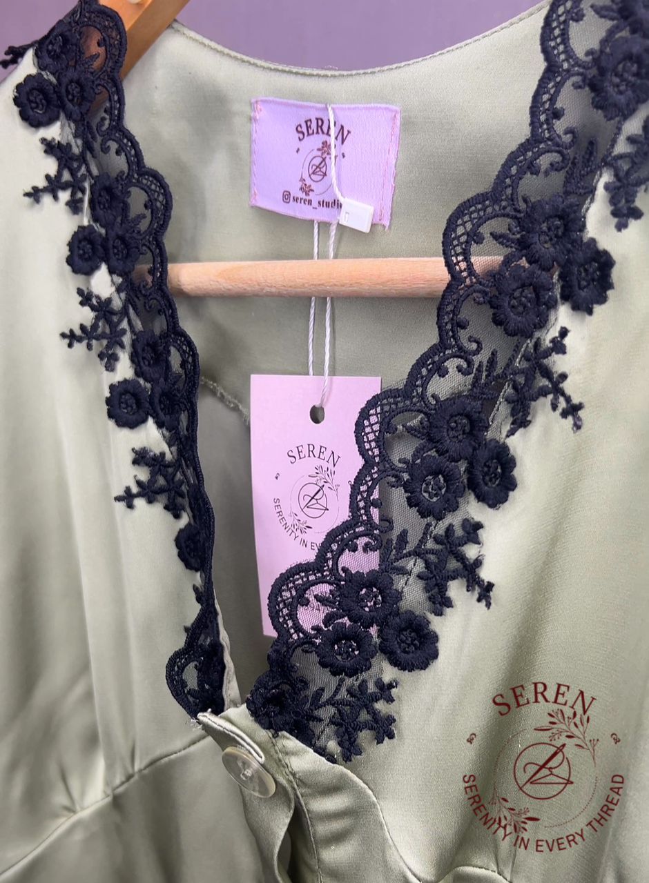 ست لباس خواب بلوز شلوار ساتن ماچا - توری